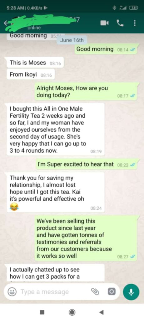 “I’m almost speechless! The results I received from using this Male Fertility Solution Tea are better than I ever imagined. I had difficulty experiencing erection before I tried your product. Now I’m having the most amazing sex I’ve ever had in my life. I’m knocking the socks of my wife every time we make love. I can’t believe it and she can’t believe it either! Thank you!” MR ADESANYA, ILARO, OGUN STATE